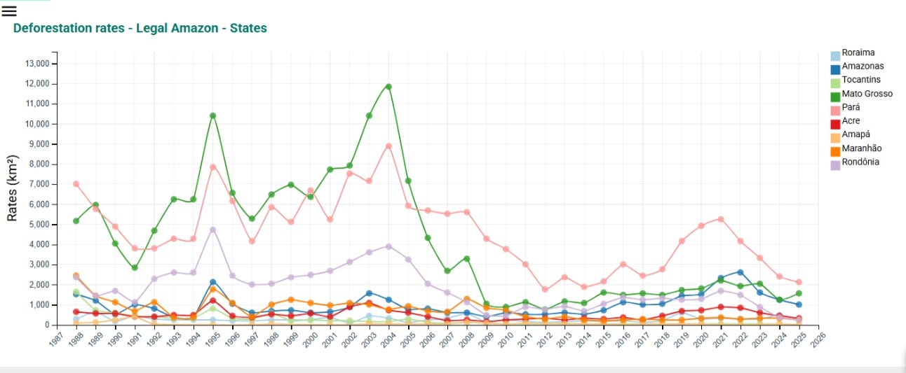 A major reason for recent improvement is the revival of Brazil’s Action Plan for the Prevention and Control of Deforestation in the Legal Amazon (PPCDAm). First created in 2004, this plan coordinates government action against illegal forest clearing. It was defunded in 2019 but restarted in 2023, helping reduce deforestation across the region (PPCDAm, 2023).